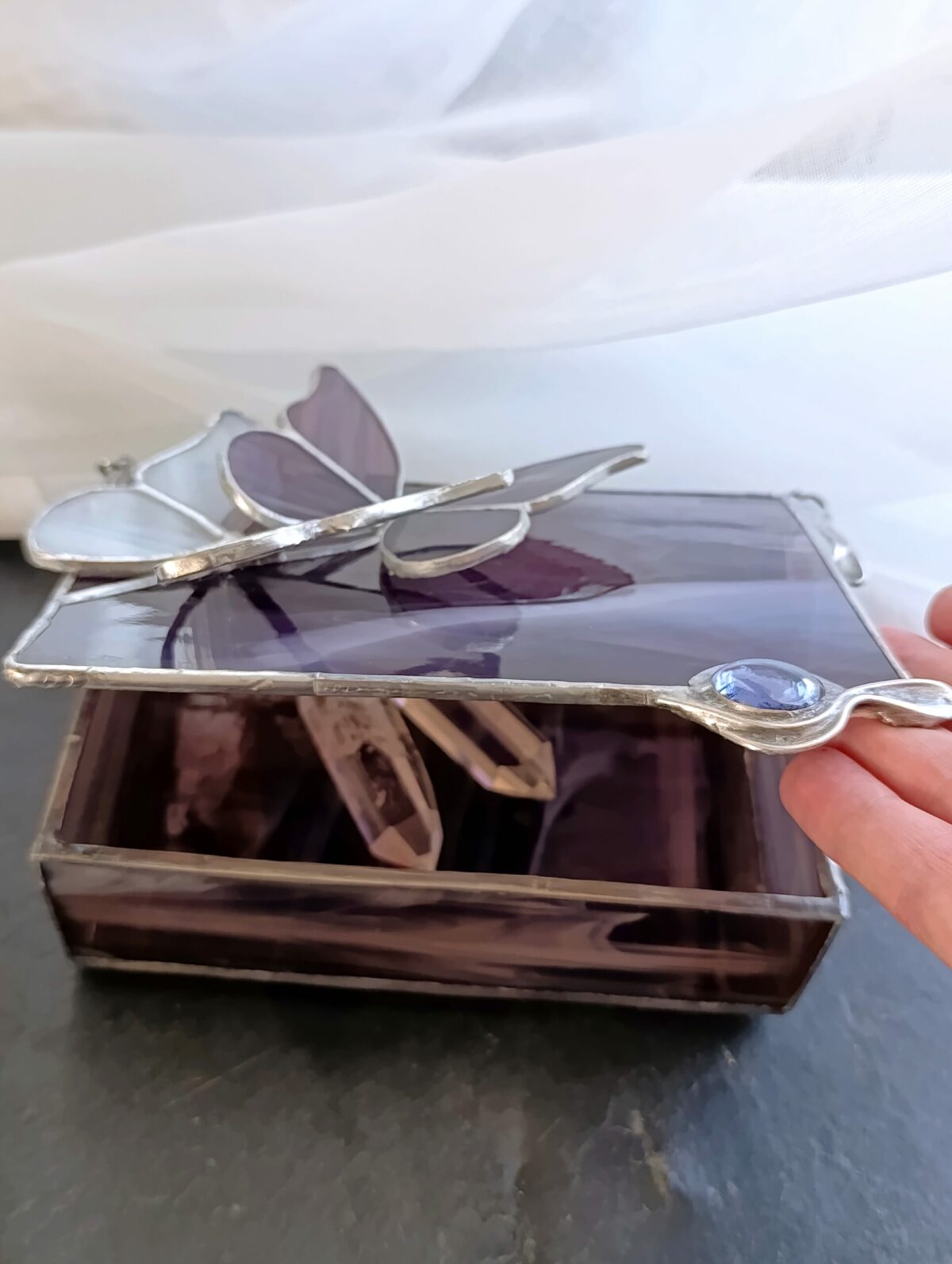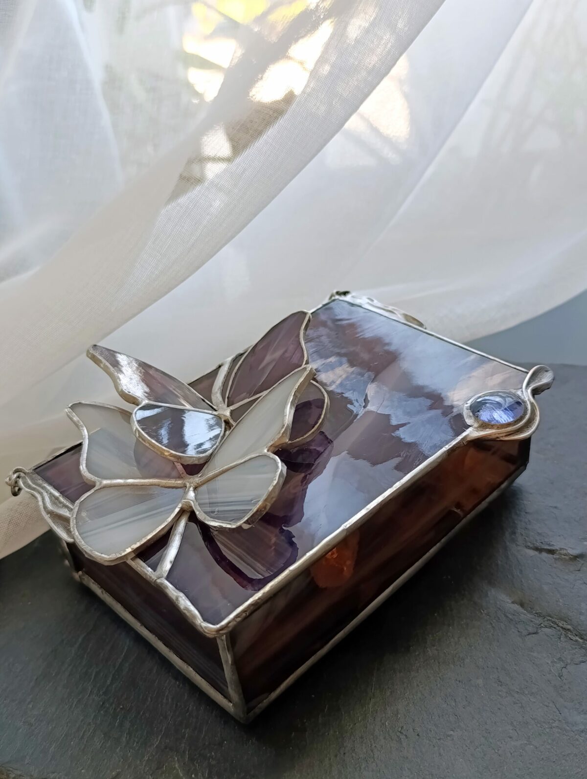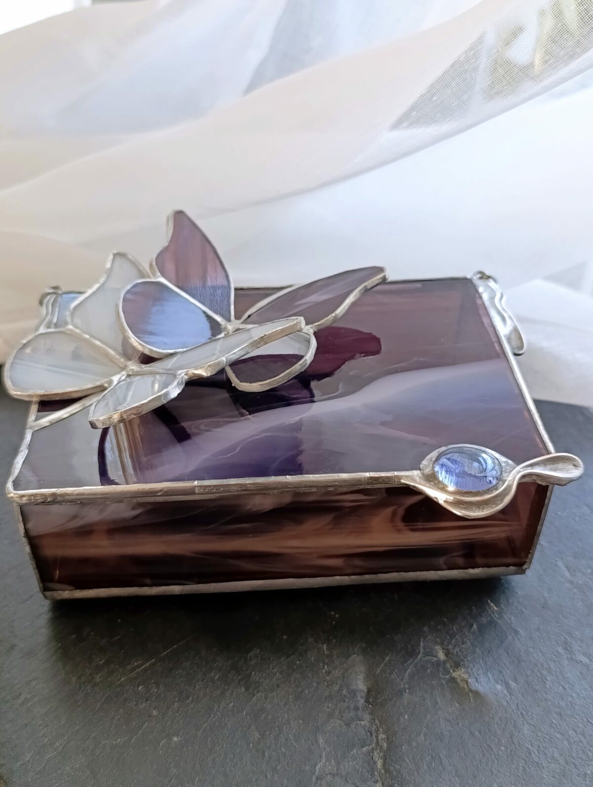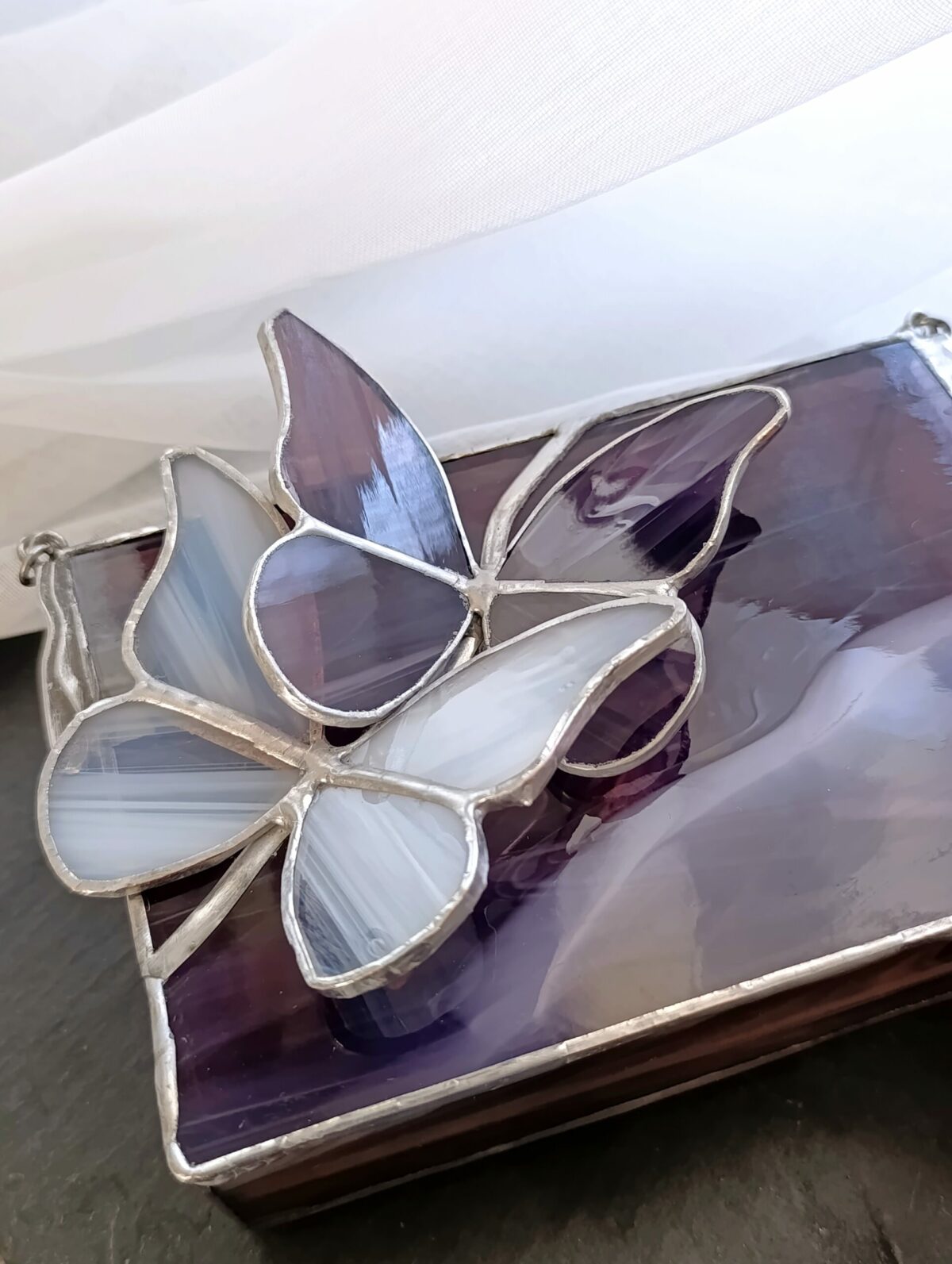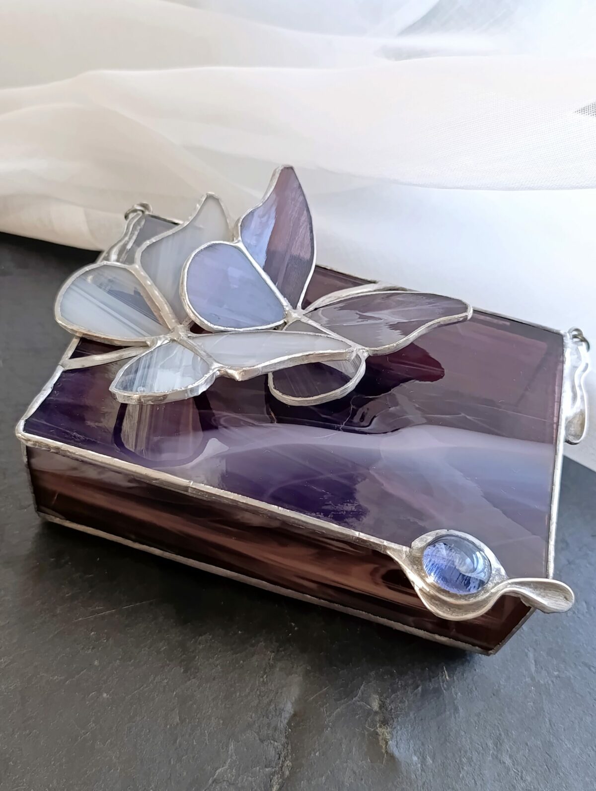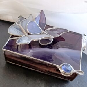 Fiolet w odcieniu oberżyny z białymi mgiełkami snującymi się po płaszczyznach to doskonały przykład jak piękne jest szkło artystyczne. Motyle współtworzą kompozycję. Szkło igra ze światłem a szkatułka staje się elementem wystroju w pełni użytecznym. Wymiary 15x10x4cm są dopasowane do kobiecych potrzeb.