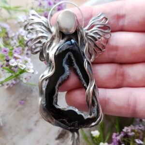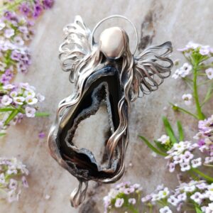 Baryt lok. Maroko przestrzenny jakby ukwiecony minerał o nasyconym wybarwieniu od ecru aż do sieny. Wzbogaca przestrzeń swoją obecnością a z pozoru delikatna struktura zaskakuje twardością. Baryt skupia uwagę i zatrzymuje na chwilę. Daje wytchnienie i zachęca do poszukiwań: celu, motywacji, wiedzy. Połączyłam z żywiołowym agatem ognistym lok. Meksyk. Tu robi się na prawdę gorąco. Tak jak baryt wzbudza ciekawość strukturą , tak agat rodzi pasję do życia, ludzi, świata zamkniętym „ogniem” w kaboszonie. Energia agatu ognistego zachęca do doświadczania życia w pełni, również na planie fizycznym. Takie mocne połączenie nasycone kolorami, dynamicznie rozprawia się z tym co podcina nam skrzydła. Energetycznie… wyrwa z letargu, apatii i odcina od tendencji depresyjnych. Mówi się, że jest to kamień przebudzenia się na nowo do życia.