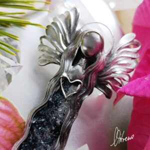 Natura już się o to postarała. Ten kwarc z hematytem lok. Afganistan to dla kolekcjonera okaz a dla twórcy fragment projektu. Będąc w posiadaniu tak wyszukanego minerału zdaję sobie sprawę z odpowiedzialności jak ciąży na mnie wykonując oprawę. Skromność nade wszystko, gdyż jako cnota dodaje delikatnym muśnieciem należytego szyku. Kwarc: 7 w/g skali Mohsa przyciąga magnetycznym blaskiem hematytu. Gwiazdy skryły się na nieboskłonie i tylko nocne niebo darzy. Kiedy patrzę w rozgwieżdżone niebo marzę.