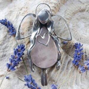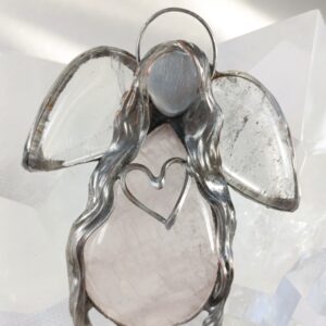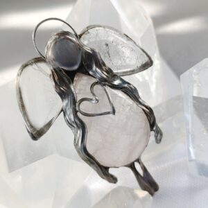 Delikatny – jasnoróżowy w „masywnej” bryle polerowanego kaboszonu jest dobrze wyeksponowany. Kwarc różowy to obfitość a Aniołek Vitrene ma jej ogromne pokłady. Kwarc wśród minerałów góruje twardością (7 w skali Mohsa) nie ulega, ale nadaje kształt i trzyma się wyznaczonym celom. Na miłość bezwarunkową i empatię – kamień szczęścia ROSE QUARTZ.