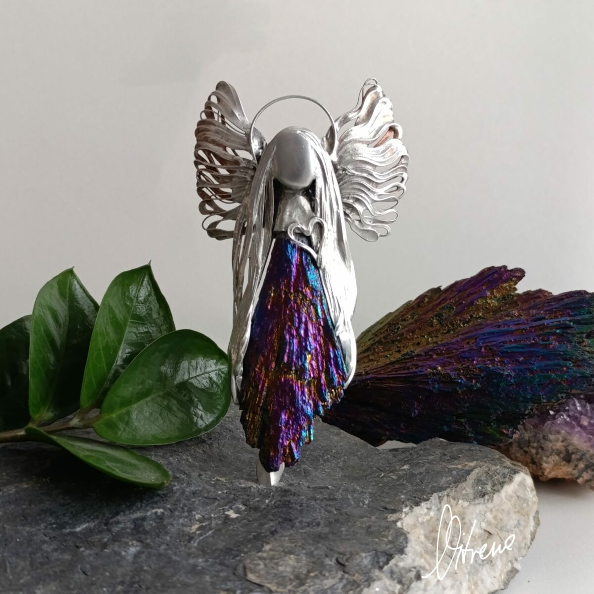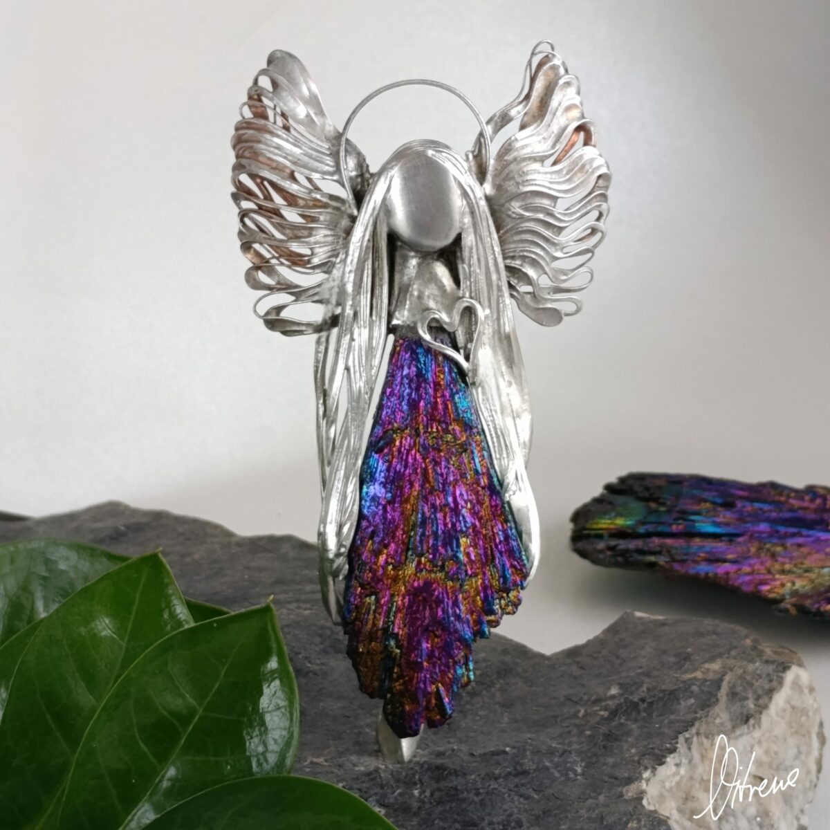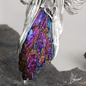W blasku niesie radosne ukojenie. Zapisuje zwykłe chwile! Te kolory! Tytanowa powłoka iryzuje reagując na ruch i cudnie obdarowuje kolorem. W głębi pozostaje sobą. Kyanit o igiełkowej strukturze jak wachlarz roztacza swe wdzięki. Szlachetny o strukturze igielkowej kyanit kieruje się wprost do serca. Zagląda, nie narzuca się bo kieruje nim mądrość i rozwaga. W swej delikatności wprowadza ład i porządek. Kreuje emocje i otwiera na kompromis. W sposób dyplomatyczny przebija się przez negatywne myśli.
