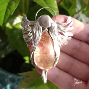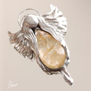 Kwarc z rutylem w formie kaboszonu. Czysty kwarc poprzecinany Włosami Wenus z greki Aphrodite=wdzięk, urok. Bogini miłości. Metaforycznie… w anielskiej oprawie Vitrene miłość niech trwa.