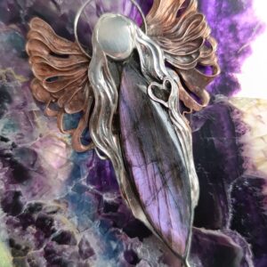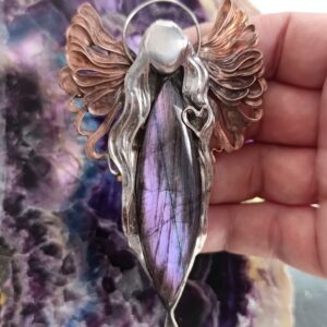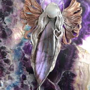 Wydobyty z ognia fioletowo-złotego ten labradoryt określany mianem spektrolitu wynosi myśli ponad codzienność. Praca nad tym Aniołem to z jednej strony spokój i kontemplacja a z drugiej presja tworzenia, niecierpliwość, czy na pewno to właściwy kierunek. Wyłonił się ON. Czuję niebywałe połączenie wewnętrznego ognia a światło dodaje majestatycznej formie właściwego blasku. Intuicyjne czuję, że to nie jest zwyczajne połączenie i niebywała siła przekazu dociera do najgłębszych zakamarków duszy. Myśli wzmocnione pięknem i stabilną energią wprowadzają na drogę zmian. Fuzja kolorystyczna pogłębia poczucie transformacji, dojrzałości wewnętrznej, która wchodzi z pewnością na nową drogę.