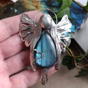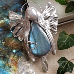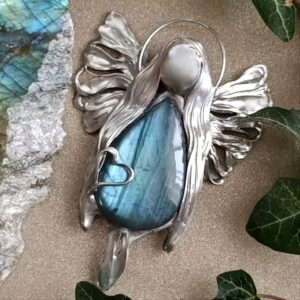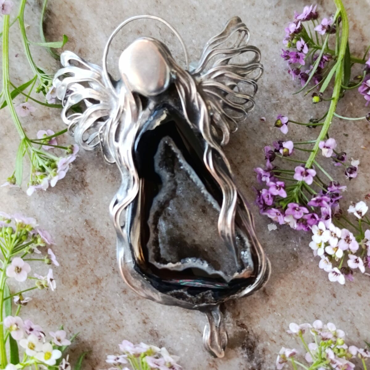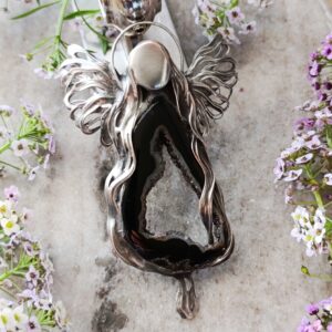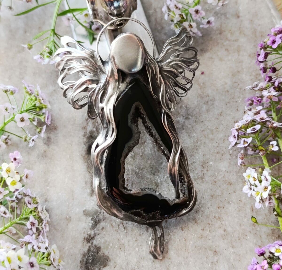 Baryt lok. Maroko przestrzenny jakby ukwiecony minerał o nasyconym wybarwieniu od ecru aż do sieny. Wzbogaca przestrzeń swoją obecnością a z pozoru delikatna struktura zaskakuje twardością. Baryt skupia uwagę i zatrzymuje na chwilę. Daje wytchnienie i zachęca do poszukiwań: celu, motywacji, wiedzy. Połączyłam z żywiołowym agatem ognistym lok. Meksyk. Tu robi się na prawdę gorąco. Tak jak baryt wzbudza ciekawość strukturą , tak agat rodzi pasję do życia, ludzi, świata zamkniętym „ogniem” w kaboszonie. Energia agatu ognistego zachęca do doświadczania życia w pełni, również na planie fizycznym. Takie mocne połączenie nasycone kolorami, dynamicznie rozprawia się z tym co podcina nam skrzydła. Energetycznie… wyrwa z letargu, apatii i odcina od tendencji depresyjnych. Mówi się, że jest to kamień przebudzenia się na nowo do życia.