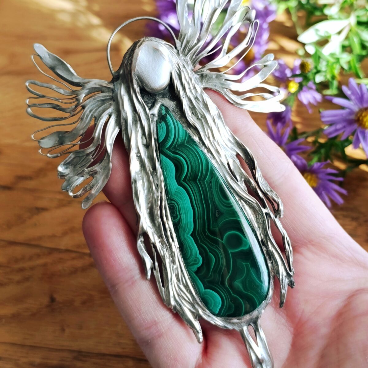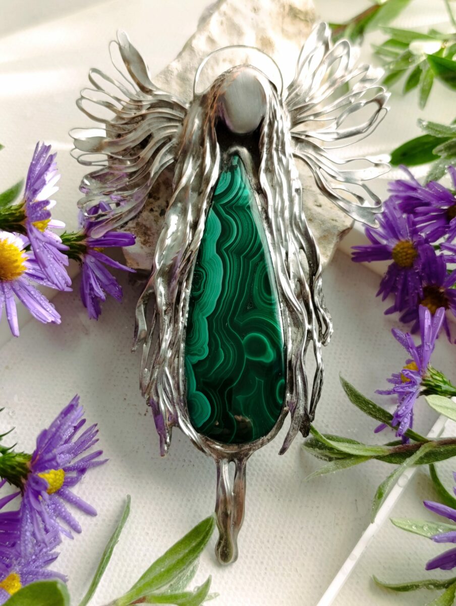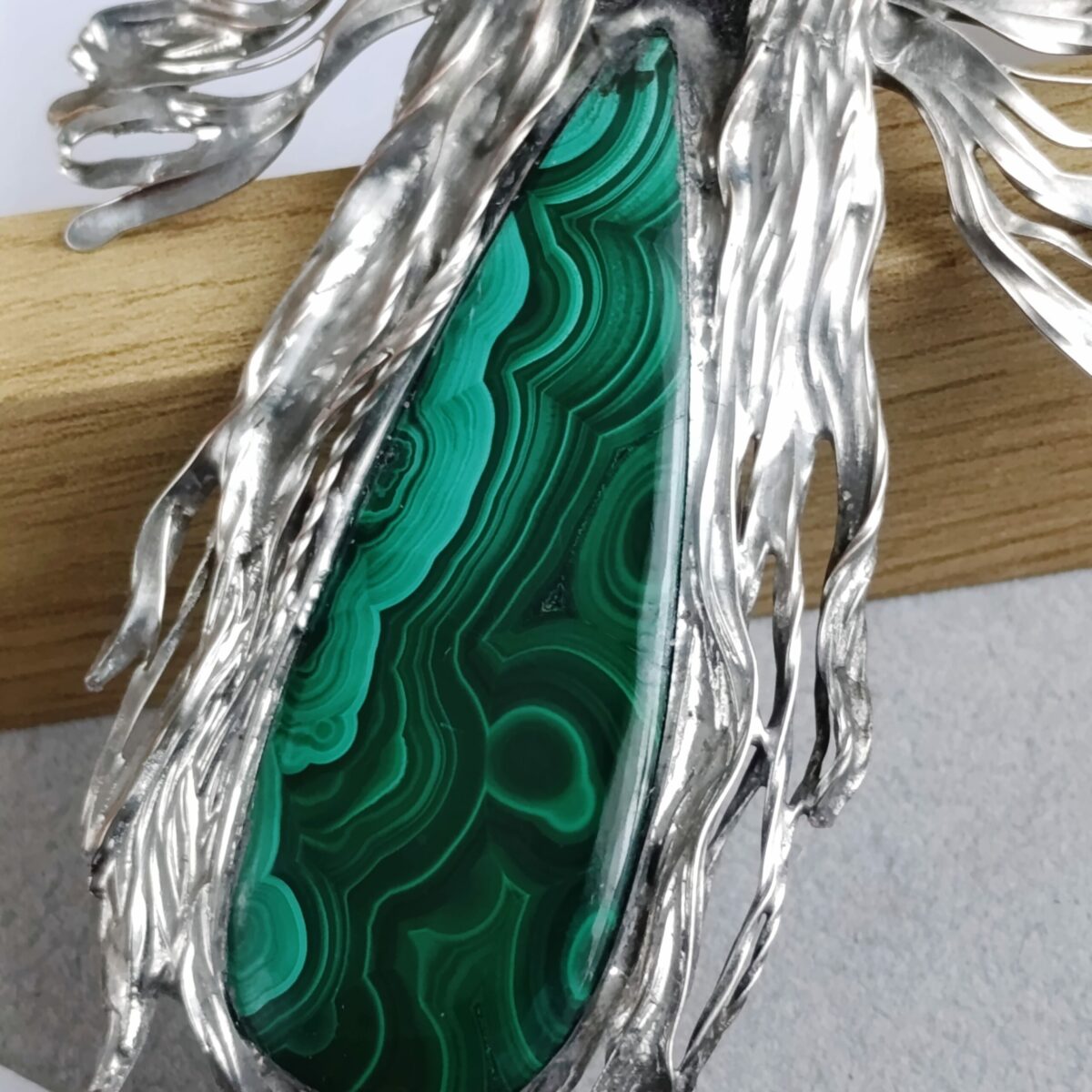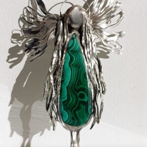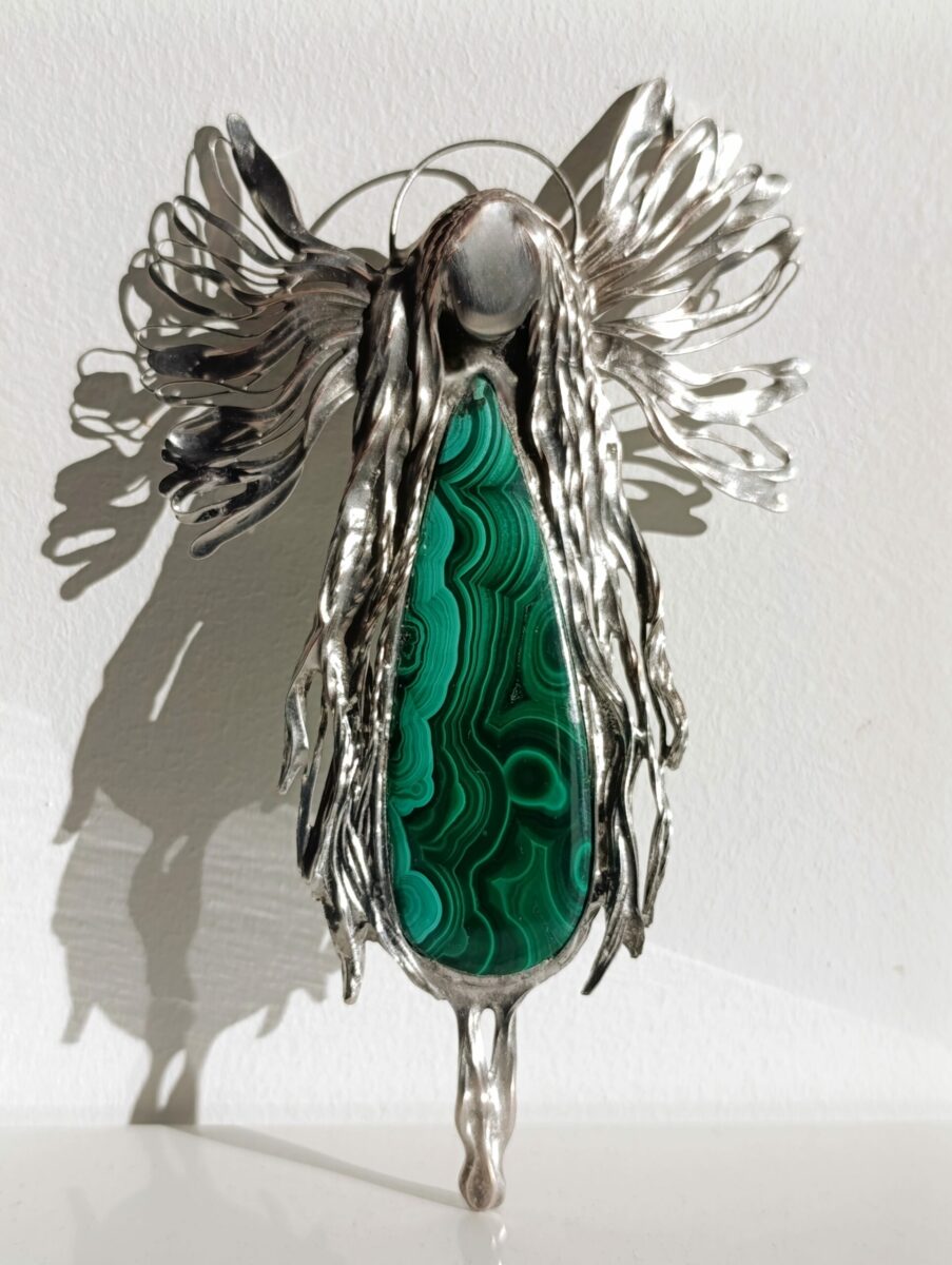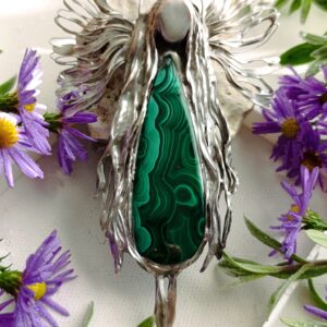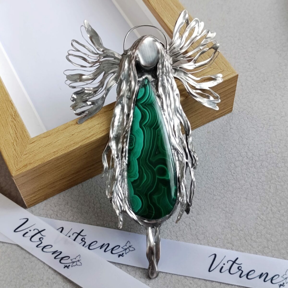 Za barwę malachitu odpowiada miedź, dlatego też najczęściej spotyka się go w miejscach utleniania złóż miedzi. Malachit nazywany jest Kamieniem Natury. Forma Anioła, gdzie eksponuję naturalną, polerowaną powierzchnię malachitu.