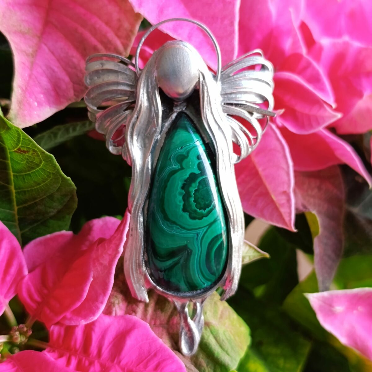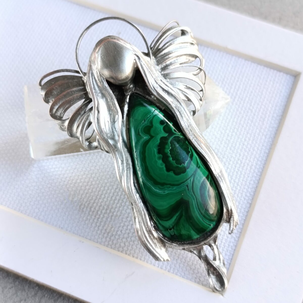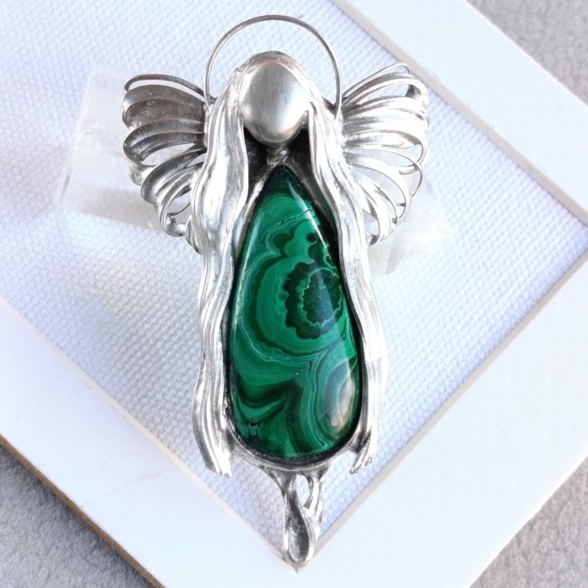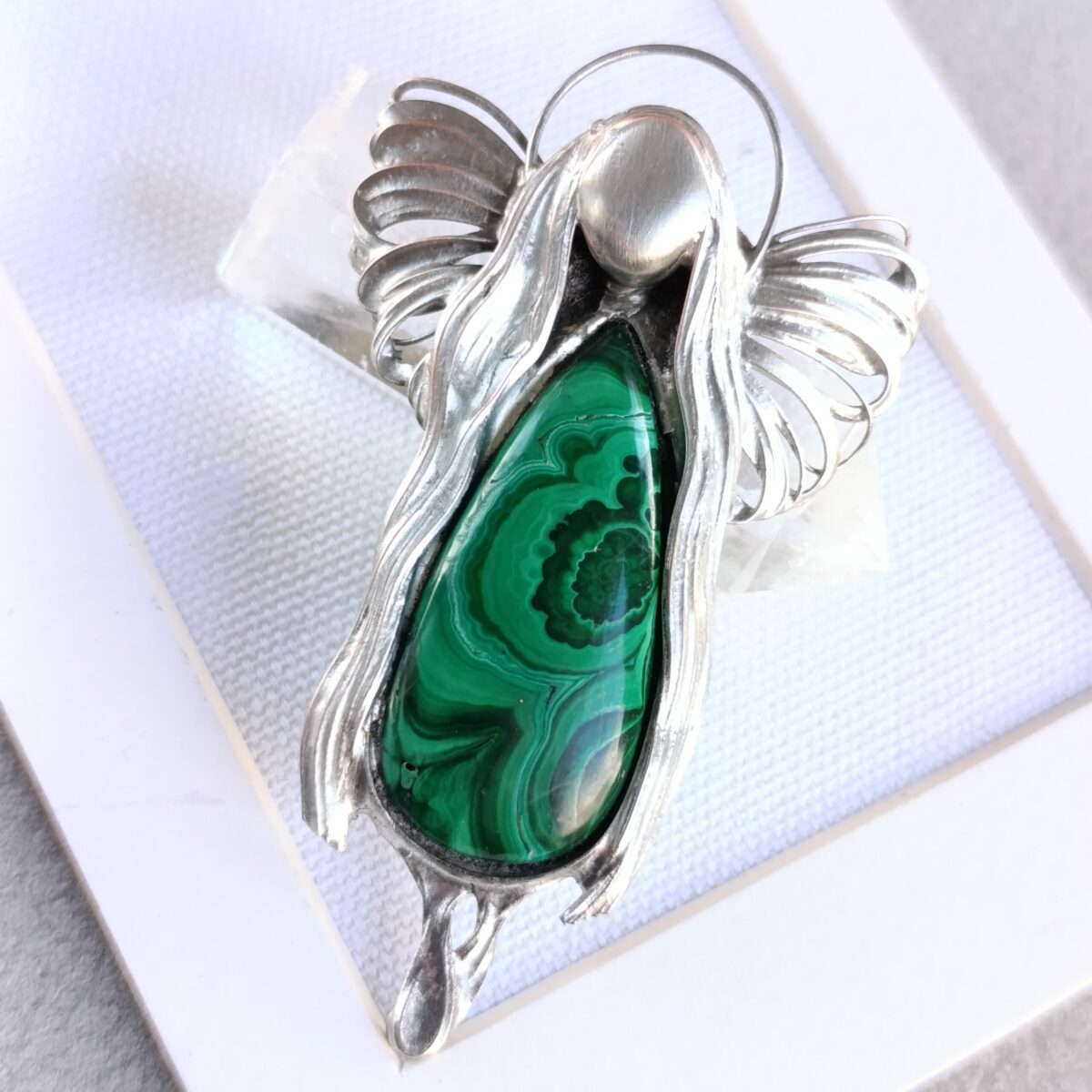 Zielony minerał w formie kaboszonu polerowanego. Wyeksponowany wzór na powierzchni poprzez wyjatkowe zestawienie barw. Zieleń sprzyja odzyskaniu wewnętrznej równowagi oraz wspomaga koncentrację. Nastraja optymistycznie i sprzyja ogólnej regeneracji Malachit posiada właściwości ochronne, które czerpie prosto z przyrody (miedź). Jest przydatny w czasie nadchodzących zmian, sprzyja dobremu obrotowi spraw oraz bezproblemowemu przejściu przez wszelkie zawirowania. Wspomaga i otwiera serce na miłość. Malachit jest kamieniem obfitości i dostatku w każdej dziedzinie życia. Zwiększa kreatywność, zdolności poznawcze oraz umiejętność obserwacji.