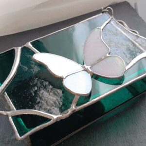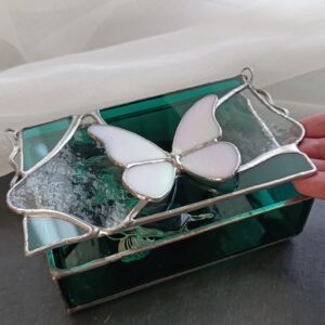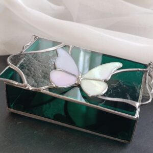 Szkatułka z motylem w kolorze białym, który iryzuje w świetle. Delikatne odcienie różu i seledynu w połączeniu w wyrazistymi płaszczyznami w kolorze szarym i morskim to zestawienie, które wyróżnia się głębią koloru.