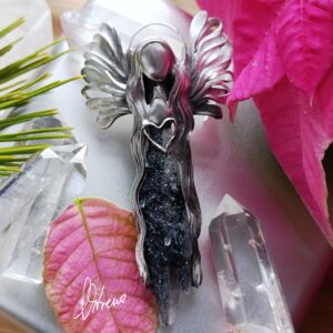 Anioł Vitrene w sukience wyrzeźbionej z naturalnego hematytu. Jest to kryształ zbudowany z tlenku żelaza Fe₂O₃. Należy do jednych z najobficiej występujących minerałów na powierzchni ziemi w płytkiej skorupie. Znany jest z czarnego koloru i metalicznego połysku. Jego cechę rozpoznawczą stanowi widoczna w przypadku zadrapania powierzchni, czerwona rysa (przedmiotem o twardosci powyzej 7 w skali Mohsa), stąd też nazywany bywa krwawnikiem. Najczęściej występuje w Afryce Południowej i Brazylii oraz Kanadzie. Kamienie mające formę płatków określane są żelazną różą i cenione przez kolekcjonerów. Jego charakterystyczny połysk to efekt silnego załamania i odbicia światła wynikającego z wysokiego współczynnika refrakcji. Tu w naturalniej nieszlifowanej formie jest pokryty tysiacami iskier niczym gwiezdny pył.Najstarszym pigmentem mineralnym wykorzystywanym przez człowieka od co najmniej 100 tysięcy lat jest ochra, którą pomalowano figurkę Wenus z Willendorfu (około 30 tysięcy lat temu), ściany jaskini Lascaux (15 tysięcy lat temu), czy neolitycznej osady Çatalhöyük (8 tysięcy lat temu). Ochrę czerwoną wytwarzano ze skalnej zwietrzeliny bogatej w tlenki i wodorotlenki żelaza, np. w hematyt, który po sproszkowaniu ujawniał barwę wiśniową. Prehistoryczna kopalnia tego minerału znajdowała się m.in. w regionie świętokrzyskim, w dolinie rzeki Kamiennej.Hematytu nie przyciaga magnes.Anioł Vitrene z hematytu łączy w sobie elegancję, symbol ochrony i fragment fascynującej historii geologicznej Ziemi.Hematyt od dawna kojarzony jest z poczuciem stabilizacji i skupienia. Jego ciemna, metaliczna barwa bywa odbierana jako symbol siły, uporządkowania i równowagi, co może wzmacniać poczucie pewności siebie i ugruntowania.To subtelne, psychologiczne działanie sprawia, że hematyt jest chętnie wybierany przez osoby, które lubią otaczać się przedmiotami wspierającymi spokój, koncentrację i wewnętrzny balans. -