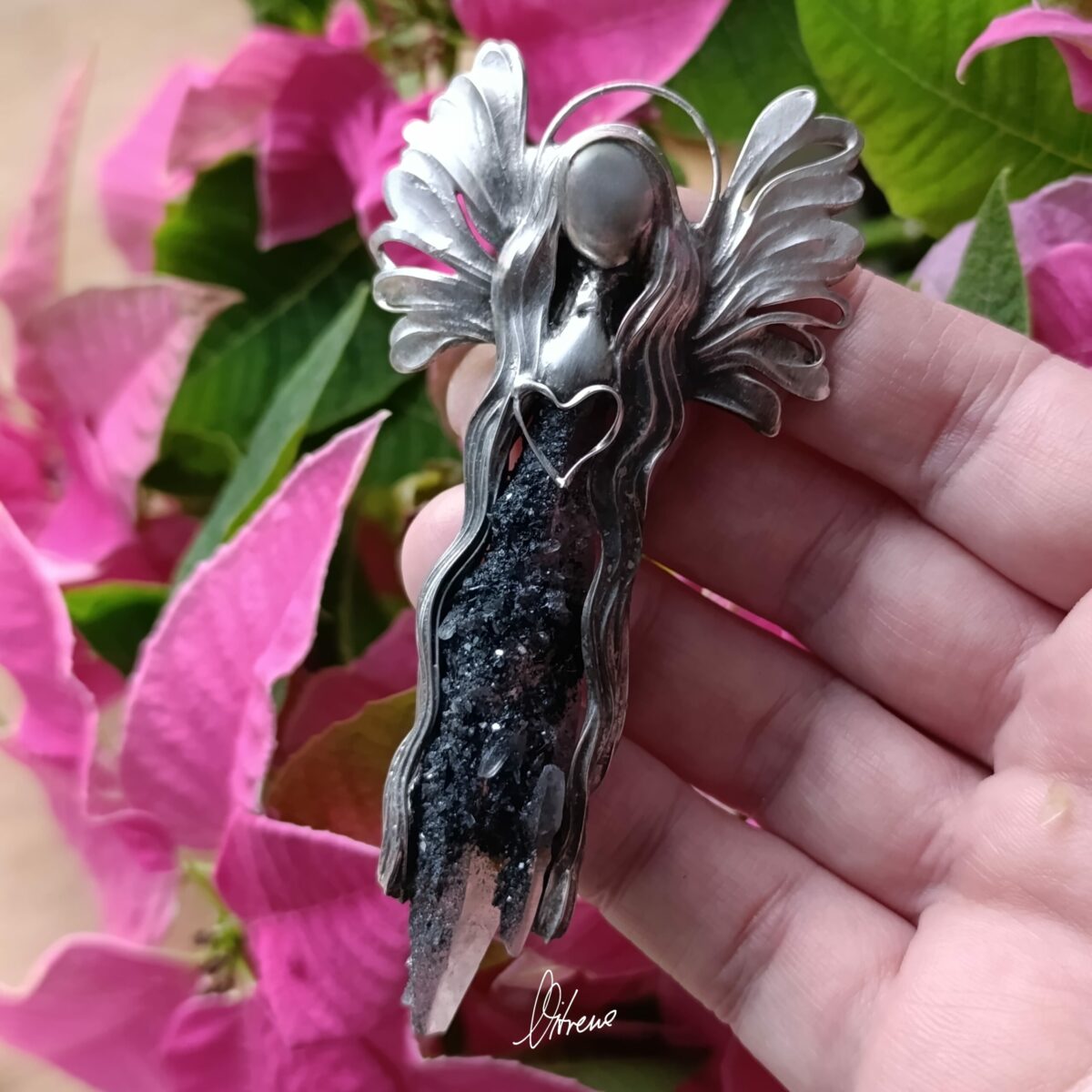 „Chodzi o to, by uchwycić nieprzemijające w tym, co przemija.”~GavarniNatura już się o to postarała. Ten kwarc z hematytem lok. Afganistan to dla kolekcjonera okaz a dla twórcy fragment projektu. Będąc w posiadaniu tak wyszukanego minerału zdaję sobie sprawę z odpowiedzialności jak ciąży na mnie wykonując oprawę. Skromność nade wszystko, gdyż jako cnota dodaje delikatnym muśnieciem należytego szyku. Kwarc: 7 w/g skali Mohsa przyciąga magnetycznym blaskiem hematytu. Gwiazdy skryły się na nieboskłonie i tylko nocne niebo darzy. Kiedy patrzę w rozgwieżdżone niebo marzę.Szata zimowa, zimna w odbiorze. W kompozycji z Aniołkiem Vitrene wprowadza szlachetność i elegancję. Kreacja nieziemska. Opiera się wszelkim przeciwnościom losu. Wytrwały i otulony w marzenia! -