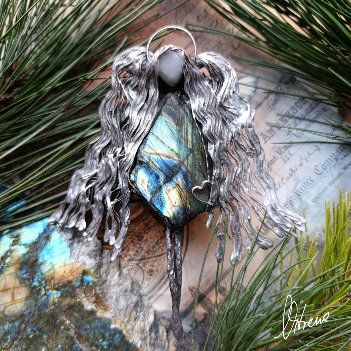 Anioł Vitrene z czarnym onyksem. a na skrzydłach ukwiecony heliotropem (krwawnik).